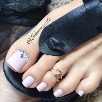 Если дама, тщательно ухаживающая за своими ногами, редко может найти время на посещения салона красоты, то идеальным вариантом для неё станет шеллак со стразами. Педикюр, фиксированный закрепителем, сушится в специальной лампе, поэтому и «носится» он намного дольше, чем нанесенный обыкновенным лаком. Здесь неплохо будут смотреться и яркие, неоновые расцветки. Для особого шика наносятся стразы, только вот размеры их должны быть умеренными, не выбирайте крупные камни, они могут смотреться вульгарно и вызывающе. С правильно подобранными инструктированными камнями ногти будут выглядеть по-королевски.