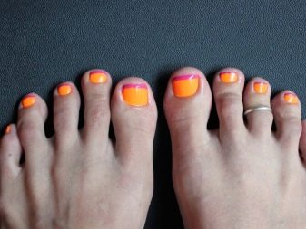 – казалось бы, этого не может быть, ведь классика есть классика, однако модные дизайнеры предлагают и такой вариант: основу лака составляет яркий оттенок, обрамляемый контрастным цветом, в результате которого получается неповторимый живописный эффект. Такая композиция идеально впишется в летний период в сочетании с однотонными стильными босоножками. Многие мастера предлагают выделить ноготь большого пальца, украсив его рисунком в основной цветной гамме, что тоже придаст индивидуальности модной женщине.