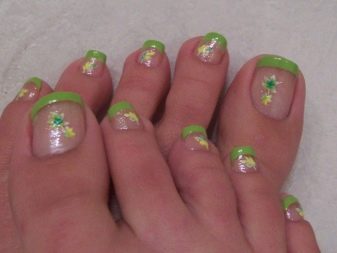 Одним из удачных решений дизайна френч педикюра является так называемый европейский – на прозрачной или матовой основе лака можно нарисовать любой элемент: от флоры до фауны, а кайму ногтей покрасить цветом, который является основным в рисунке. К примеру, зелёный кленовый листок и такой же ободок.