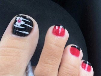 Особым шиком считается френч педикюр из ещё двух классических цветов: красного и чёрного. Такое сочетание сделает ваш образ загадочным и даже роковым. Окантовка двумя этими цветами на прозрачной основе придаст изюминку вашему педикюру. Если такая окантовка вас не устраивает, обыграйте эти цвета в стразах: чёрные и красные стразы можно выложить дугообразно или «рассыпать» по ногтевой пластине большого пальца.