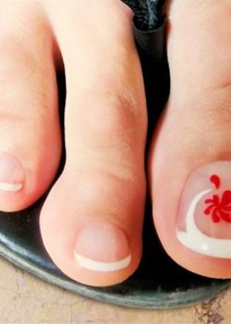 Розовый педикюр подойдет даже для не очень отросших ногтей – белая окантовка подчеркнёт их утончённость, даже если форма их не совсем совершенна. Можно использовать для базового покрытия красный цвет, но не яркий и вызывающий, а его светлые оттенки. Это прекрасный вариант и для присутствия на работе, и во время учёбы.