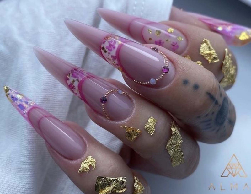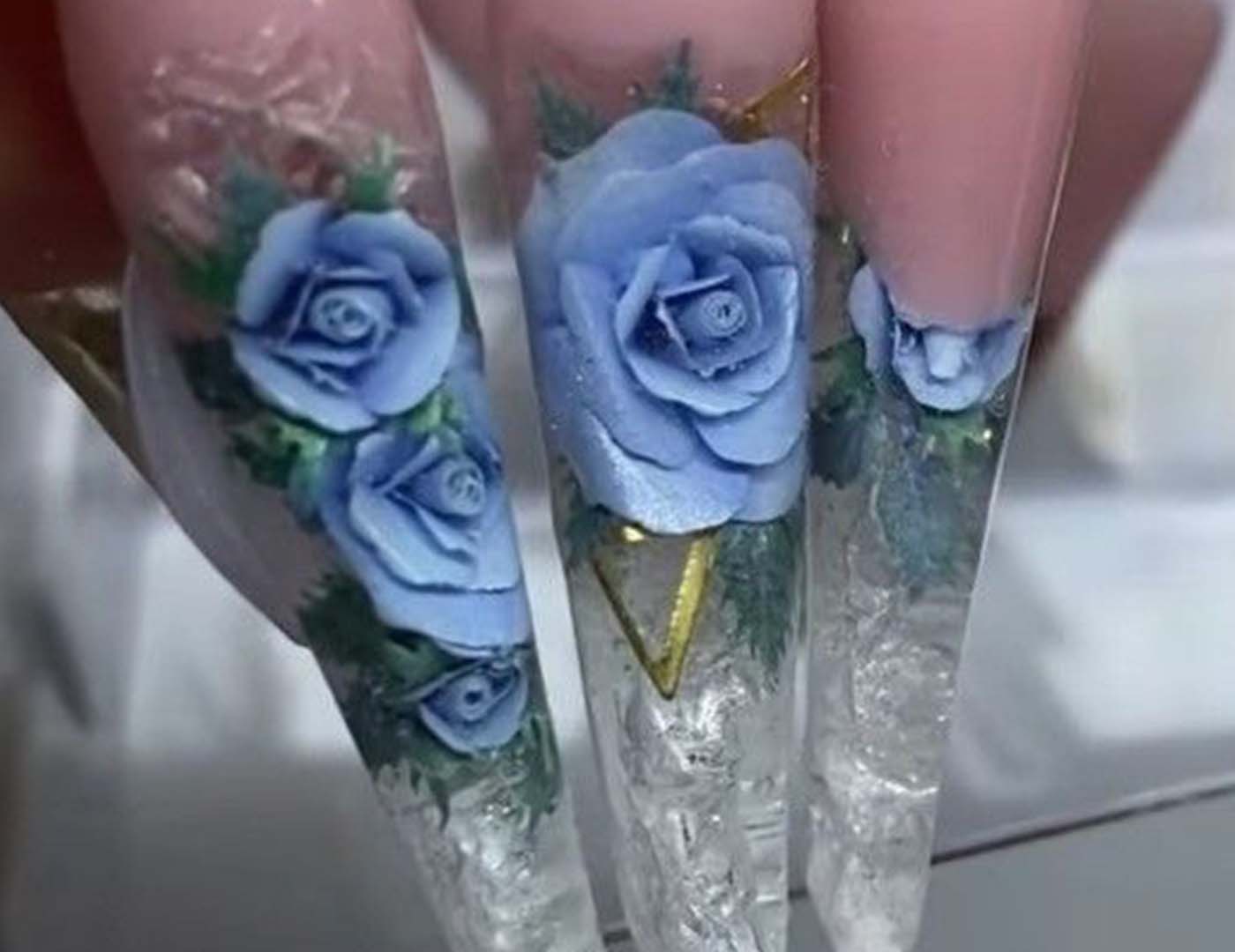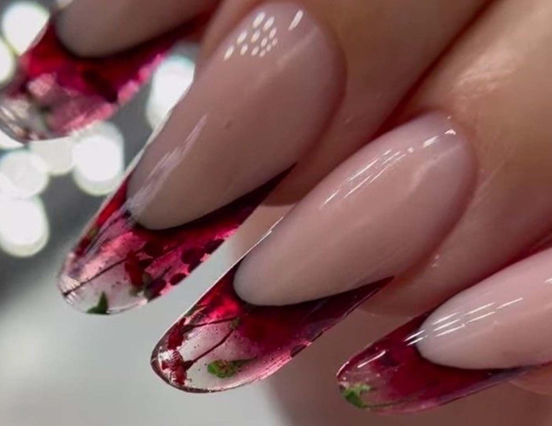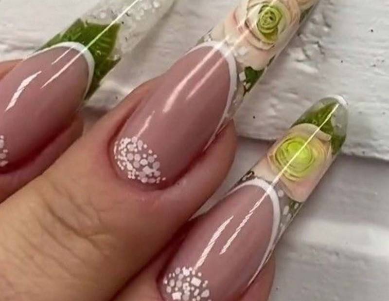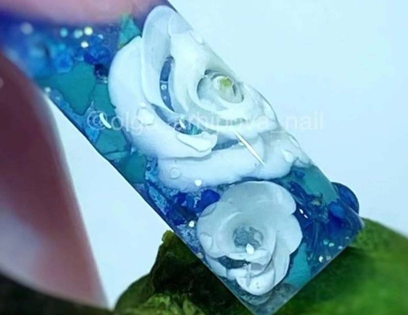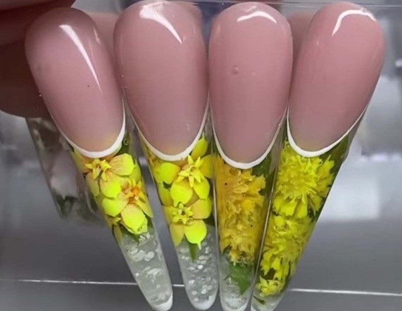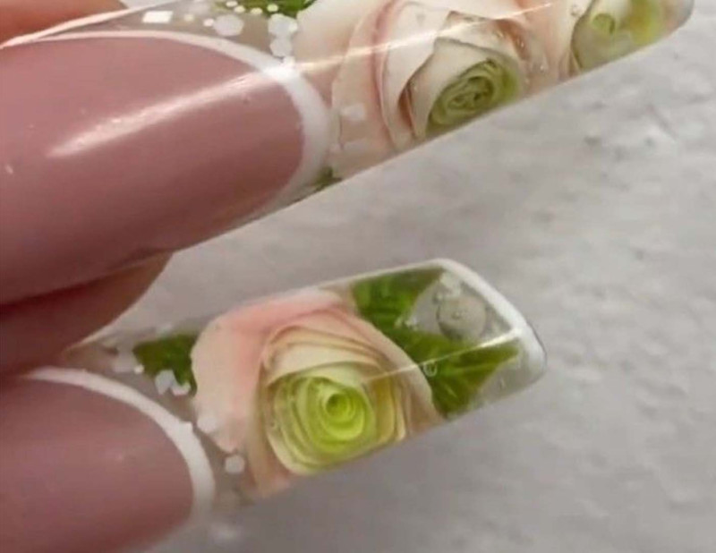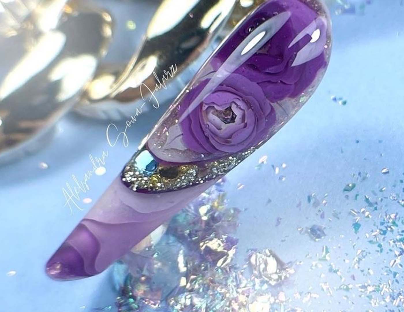 - Необычный и красивый маникюр с цветами. Технология выполнения заключается в том, чтобы сделать заранее заготовку лепестков цветным гель-лаком, и в дальнейшем собрать эти лепестки в бутон. Весь этот процесс происходит внутри верхней формы. Еще один способ создать эти великолепные цветы — обычным медицинским шприцем. В шприц наливают немного цветного гель-лака и «вкалывают» в полигель. Подобная техника пришла из кондитерского мира. Там создают шедевры в желейных тортах. Далее, для завершения конструкции, все цветы покрывают моделирующим прозрачным гелем и уже отпечатывают на ногте. Создается ощущение, цветы находятся внутри смоделированного ногтя. Просто волшебство и настоящее произведение искусства.