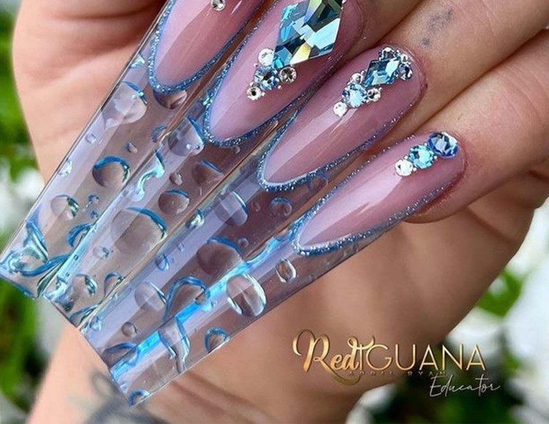 - Прозрачный, хрустальный маникюр. В этом дизайне ногтевое ложе выполнено камуфлирующим материалом, а кончик оставляют прозрачным. Для более интересного эффекта можно добавить полупрозрачного материала, потали, блесток. Но сам эффект хрустальности при этом сохраняется.