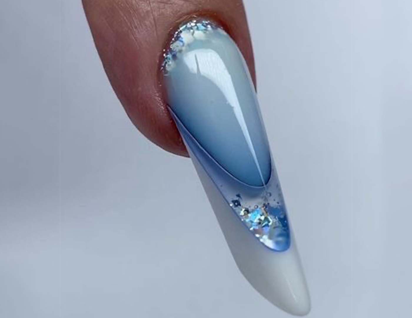 Роскошно выглядит френч-миллениум, когда свободный край выделен мельчайшим искристым глиттером, жемчужной пудрой, золотой или серебряной фольгой, крохотными стразами.