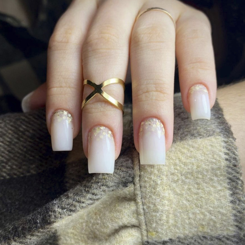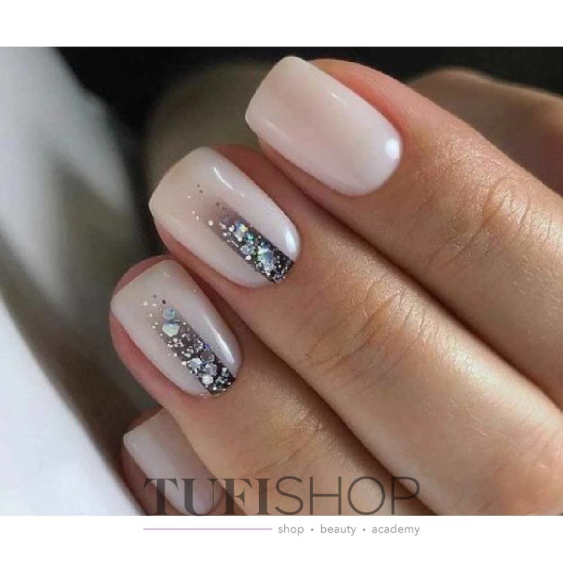 Основа может быть любого цвета — от прозрачного до черного или белого. Блестки же могут закрепляться строго на определенной линии или растягиваться до самой кутикулы.