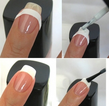 - Когда все подсохнет – наносим белые полоски. Есть 3 варианта, как можно сделать французский маникюр без полосок:
