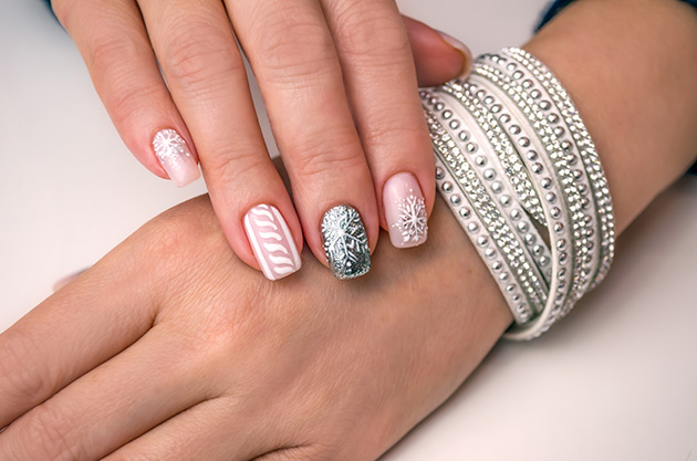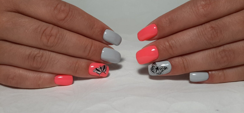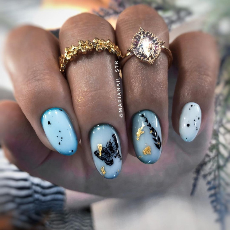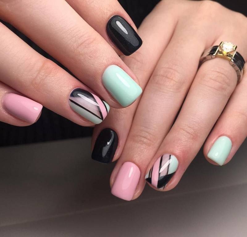 Для коротких ноготков вообще лучше использовать не слишком контрастные цветовые сочетания (например, голубой и белый, мятный и травянистый) — это зрительно удлинит ногти и пальчики.