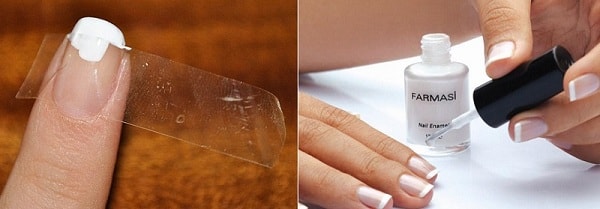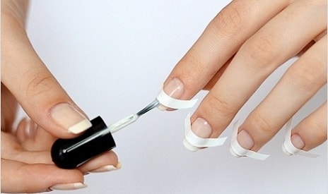 затем берем пилочку и придаем необходимую форму. После – покрываем ноготки базовым лаком (не пропускайте данный этап:маникюр вам прослужить дольше и ногти не пожелтеют). Шаг 3Далее берем полоски-трафареты и аккуратно приклеиваем так, чтобы концы ногтей были свободными