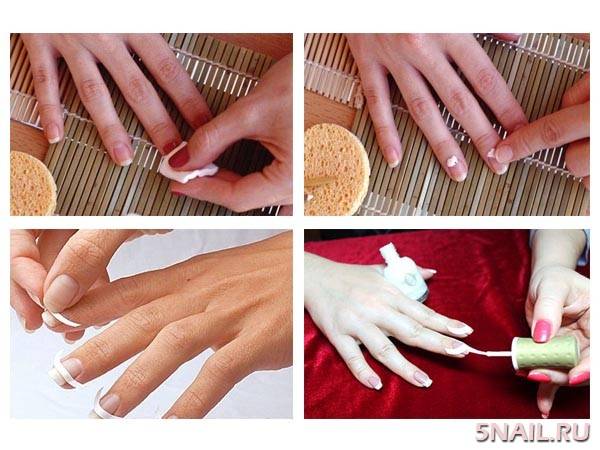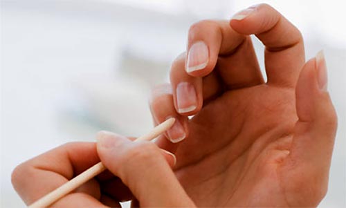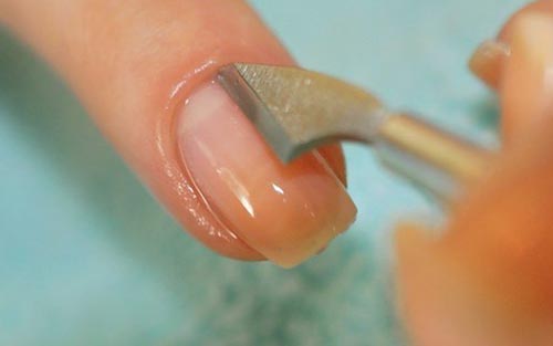 Перед тем как приступить к нанесению покрытия, необходимо тщательно обработать пространство вокруг ногтей. В домашних условиях рекомендуется использовать необрезной маникюр, поскольку сложно самостоятельно обработать пальчики маникюрными ножничками, не порезавшись. Поэтому необходимо нанести на кожу специальную жидкость или гель, смягчающие кутикулу, а затем отодвинуть ее при помощи апельсиновой палочки.