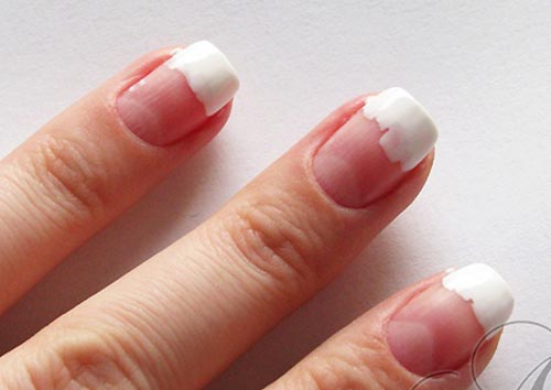 Для самостоятельной прорисовки линии необходимо нанести лак на отросший край ногтя от края к середине с одной и другой стороны. Возможные неровности можно устранить с помощью ватной палочки и ацетона.