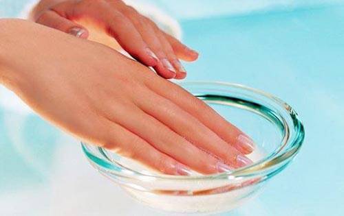 Затем делаем ванночку для ногтей. В небольшую чашу наливаем горячую воду, добавляем 1 чайную ложку морской соли, немного жидкого мыла, можно добавить несколько капель ароматического эфирного масла. Держим пальцы в ванночке 5 минут.