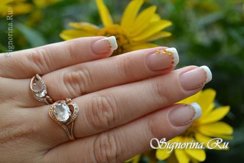 - Классический френч со спа-маникюром. Выполняется он в нежных натуральных оттенках со смягченной линией «улыбки». В спа-маникюр входят специальные размягчающие препараты, которые восстанавливают кожу рук. Стоимость такой процедуры, как правило, высока.