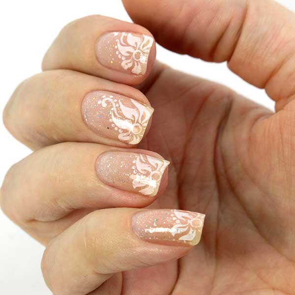 На кончики нанесите белый лак так, чтобы он не попал под трафарет