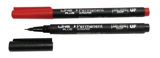 Тонкий перманентный маркер, ним можно писать на скотче и он не будет размазываться.