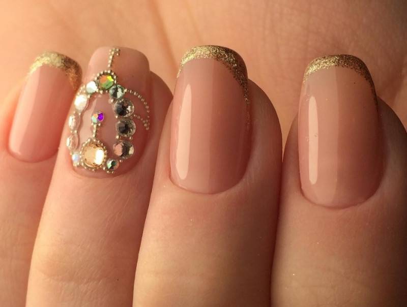 Праздничный вариант френча – золотая или серебристая разделяющая полоса или линия, украшенная блестками, мелкими стразами.
