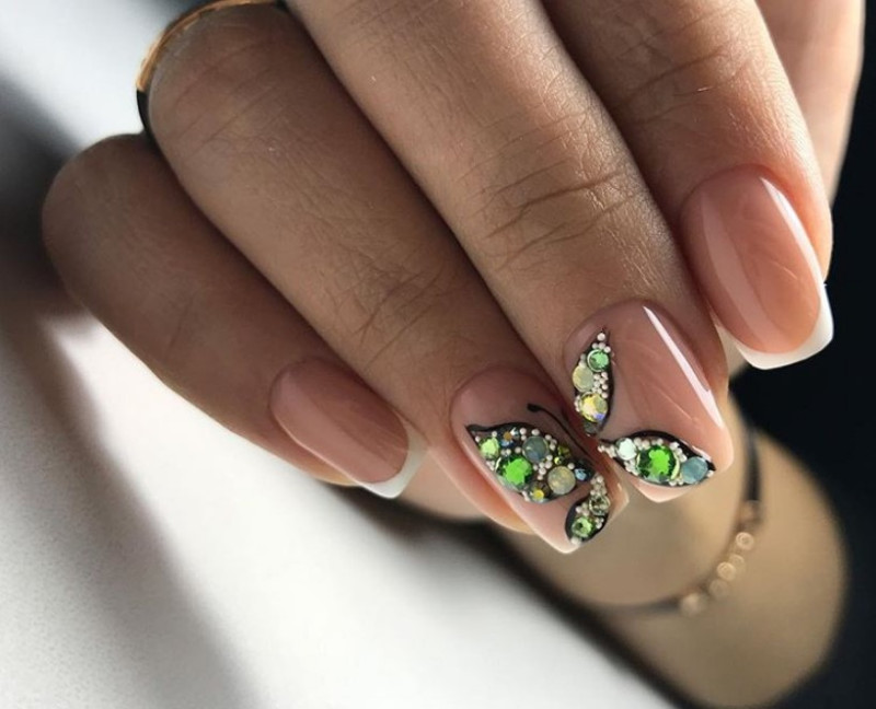 О френче с наклейками можно писать бесконечно. Технику можно выполнять в стилизованном направлении. Взять, например, за основы ботанический стиль, в котором присутствует изображение бабочек, цветочков и других растений, который располагаются поверх классического оформления.
