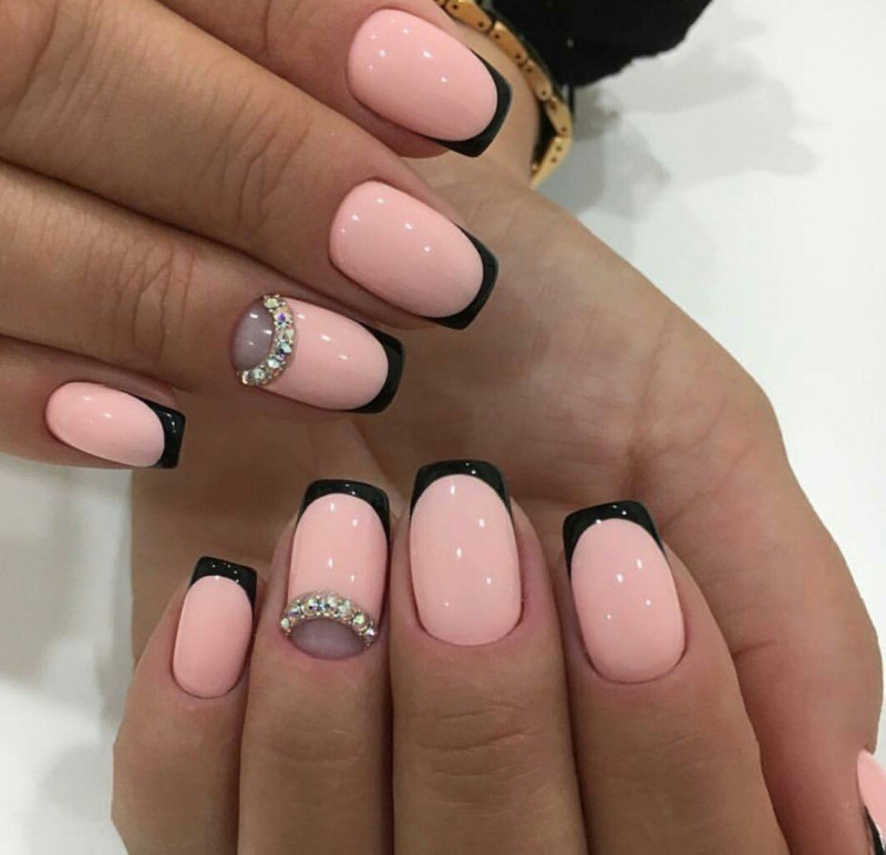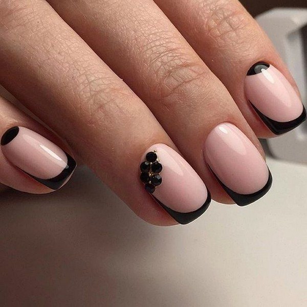 Теперь относительно границы. Плавная округлая полоса сменилась на треугольный формат. Цвет нижней части часто выполняется из двух колоров: черного и белого, красного и синего или прочих подходящих по контрасту. Для того, чтобы завершить узор, мастера в изгиб кладут стразы или используют гипюровую наклейку, которая завершает рисунок.