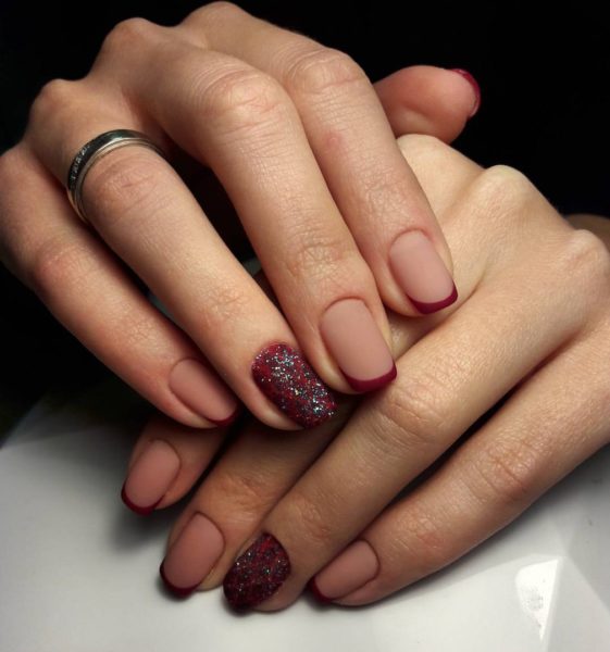 В итоге получается эффект рамки, будто маникюр взят в рамочку, как картинка. В сочетании с френчем данная техника смотрится весьма эффектно, ведь мягкие тона французского маникюра хорошо выделяются на темном фоне покрытия.