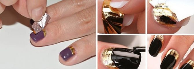 - На основание ногтя с помощью основы клеится фольга. Снизу ее обрезают по форме пластины, а сверху аккуратно расправляют, чтобы не оставалось воздушных прослоек. Используйте тонкую палочку, которая аккуратно обрисует контур ногтя внизу, и кисточку, которая равномерно распределит вашу металлизированную заготовку. Поверх фольги наносится цветной лак, оставляя лунку необходимой формы и размера не закрашенной.