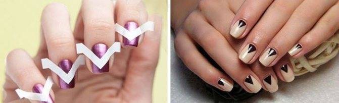 Трафареты для маникюра в домашних условиях, сделанные из скотча, клейте на ногтевые пластины так, как и обычные заготовки. Давайте полностью высыхать каждому слою основы, лака, закрепителя, которые наносите. Скотч снимайте аккуратно, но резко, чтобы точно по контуру отделить его от ногтя. Не заступайте лаком слишком далеко на клейкую ленту, иначе будет сложно ровно отделить, и маникюр получится с рваными краями.