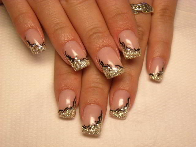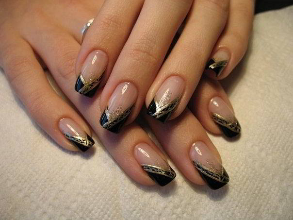Дизайн ногтей с золотом привлекает многих благодаря притягательности золотого цвета для глаза. Маникюр будет выглядеть богаче и элегантнее. Чаще и удачнее всего золотой сочетают с чёрным, который даёт нужный контраст и ещё больше выделяет золотой цвет. Чтобы создать иллюзию богато украшенных ноготков нередко золотой совмещают с серебряным, например, лаки, фольгу или заклёпки. Дизайн ногтей с золотом на фото даст самое полное представление об этом стиле украшения ноготков. Есть множество способов сделать ногти с золотым дизайном при помощи блестящих частичек. Самый распространённый – нанесение лака с золотым мерцанием или слюдой золотого цвета. Украшают таким образом, как весь ноготь, так и делают узоры или обрамляют кончик ногтевой пластины в стиле френч маникюра. Слюда и блёстки могут быть в составе лака, а можно наносить их в сухом виде. Слюда бывает очень разной – круглой, восьмиугольной, в виде прямоугольных тонких полосок. Ещё золотистый дизайн на ногтях можно сделать при помощи золотой фольги, из фольги можно вырезать различные фигурки или нанести её на весь ноготок полностью. Не забудьте при этом нанести специальный клей или подобрать специальную фольгу — самоклейку.