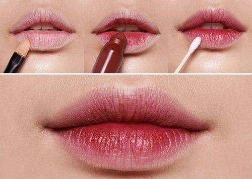 Любимая техника макияжа губ кореянок называется «градиент». Увлажненные губы следует покрыть тонким равномерным слоем консилера. Затем с помощью тонкой кисти или ватной палочки нужно нанести в центр губ немного цветного бальзама или тинта и слегка растушевать его, оставив края губ непрокрашенными. Их нужно покрыть другим оттенком тинта, бальзамом или блеском для губ.