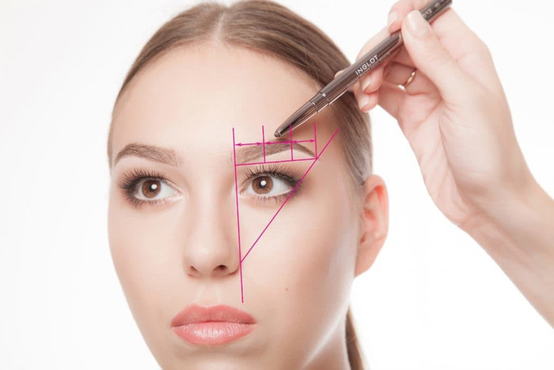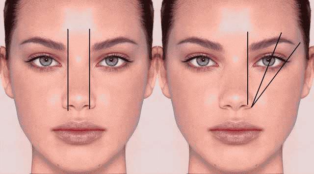 Начало брови должно быть на линии с внутренним краем глаза и кончиком крыла носа. Высшая точка на бровях должна находиться на линии крыла носа и окончания зрачка. Конец находится на точке пересечения с внешним уголком глаза.