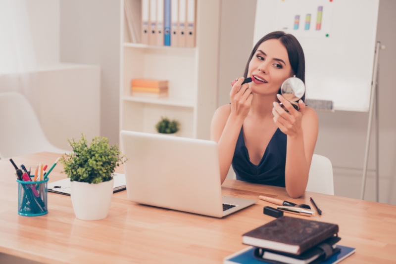 Если вы работаете в большой компании с корпоративной культурой, стоит воздержаться от использования обилия блесток и ярких цветов. Здесь ваши лучшие друзья – матовые румяна, которые обеспечат коже здоровый вид, даже если вы до трех часов ночи смотрели новый сериал. Нанесите увлажняющую помаду оттенка, который близок к вашему натуральному цвету губ. А глаза можно подчеркнуть с помощью мягкого карандаша. Старайтесь наносить его как можно ближе к линии ресниц – так они будут казаться гуще.