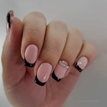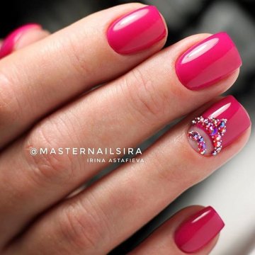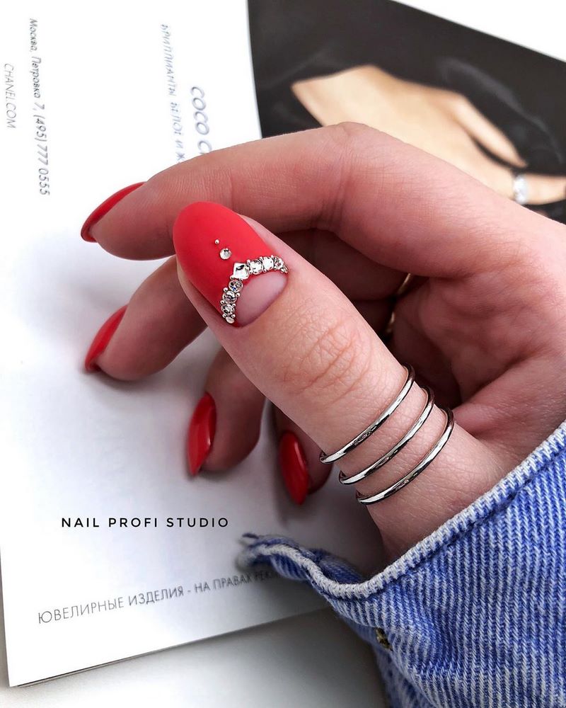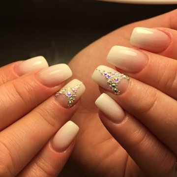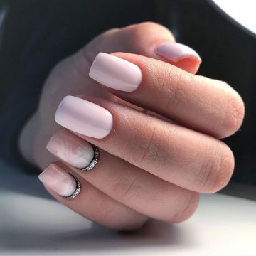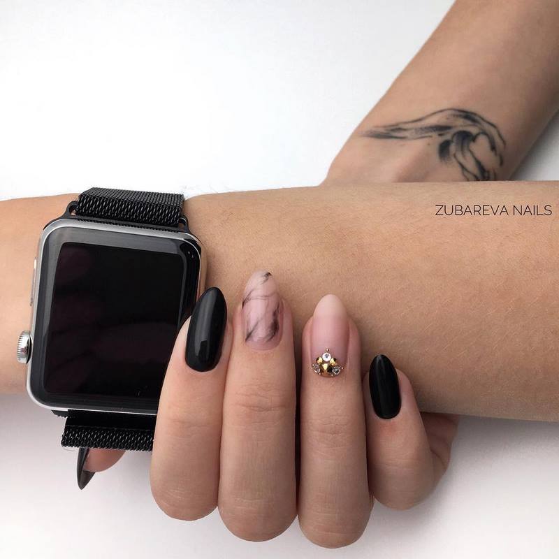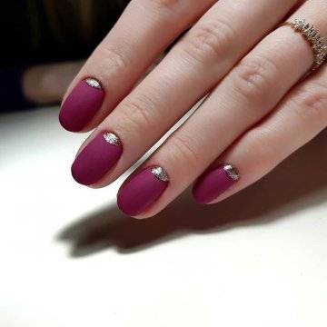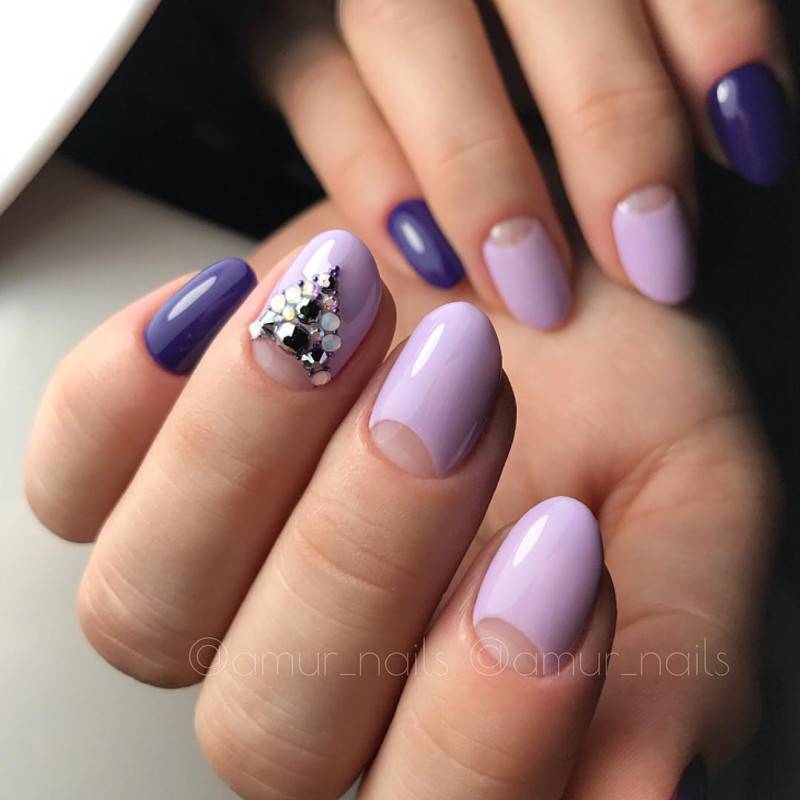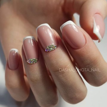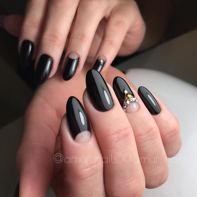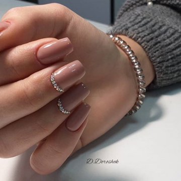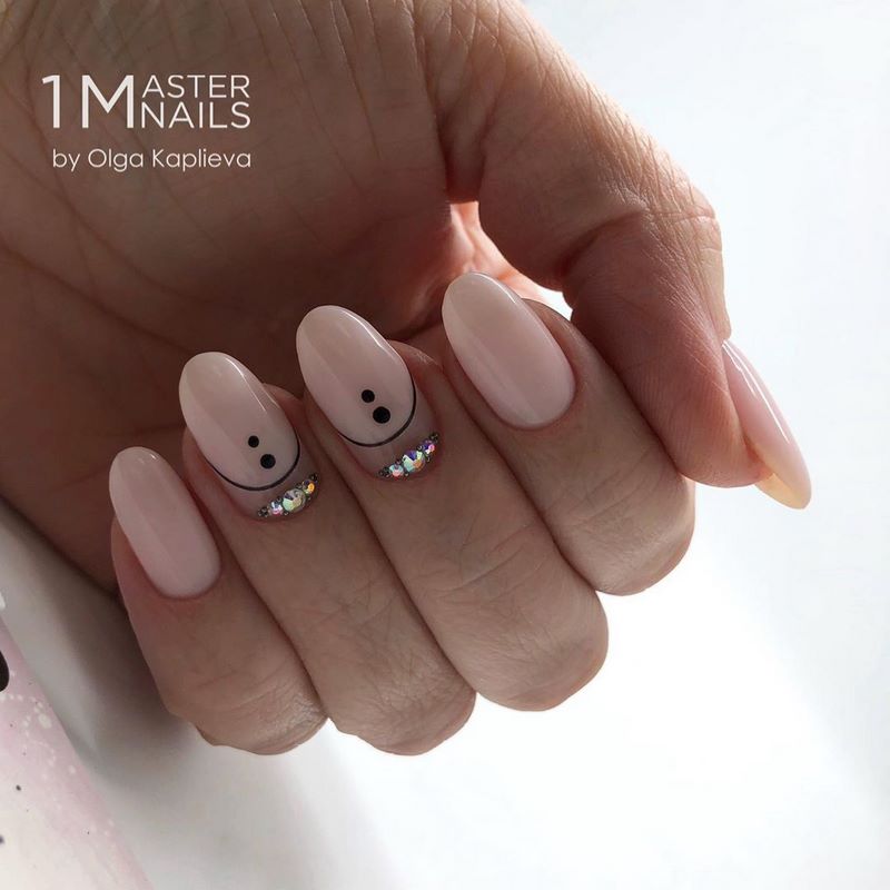 - лунный маникюр со стразами на безымянном пальце. Пожалуй, самый классический прием, который хотя бы раз пробовала каждая девушка;