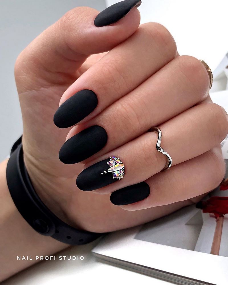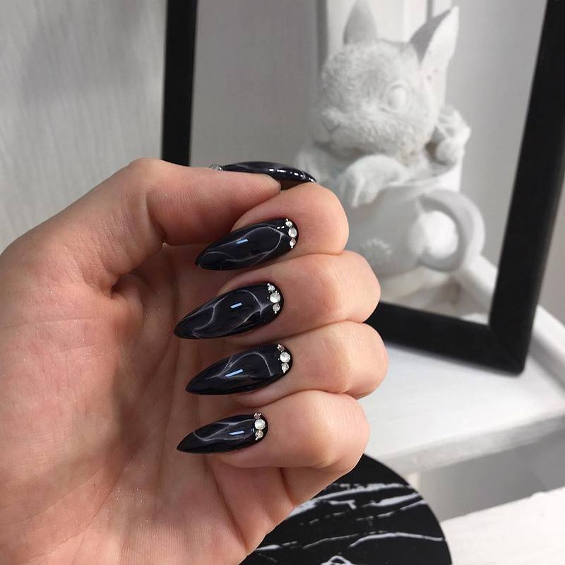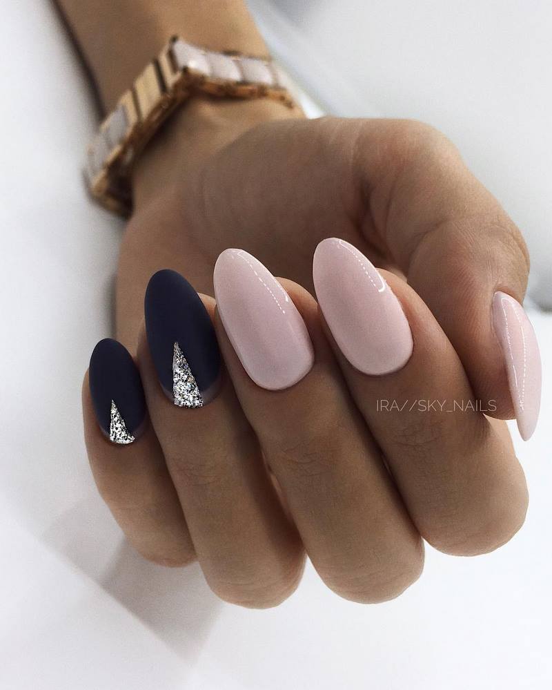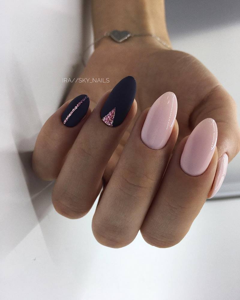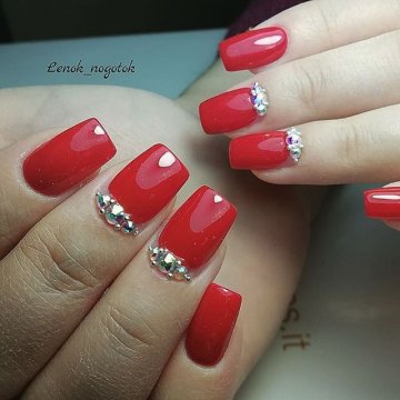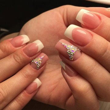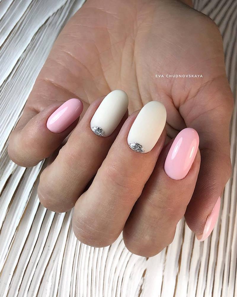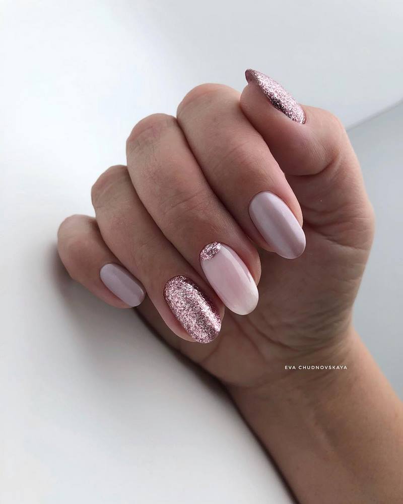 - лунный маникюр со стразами на безымянном пальце. Пожалуй, самый классический прием, который хотя бы раз пробовала каждая девушка;