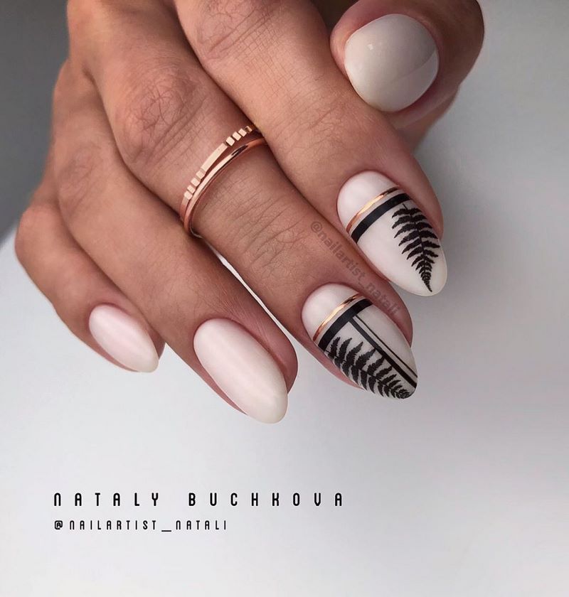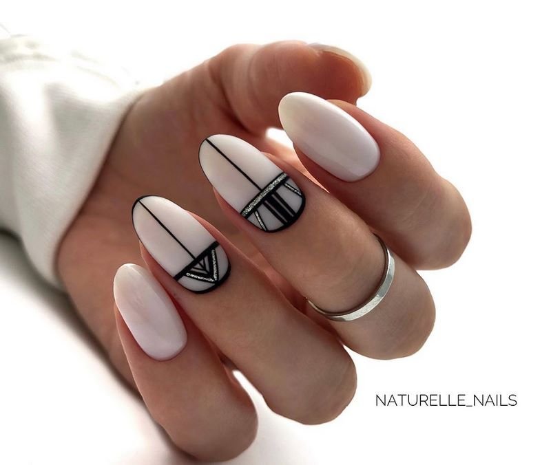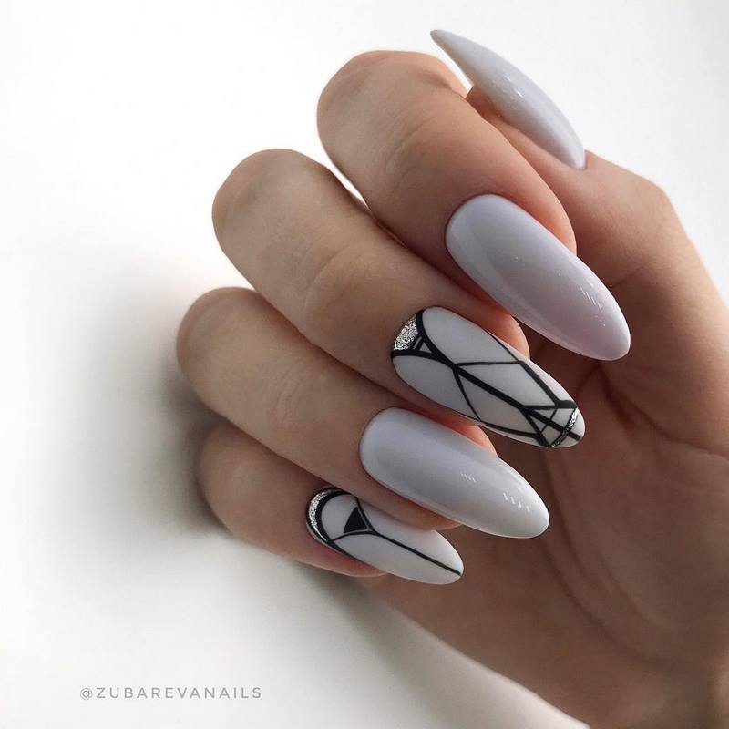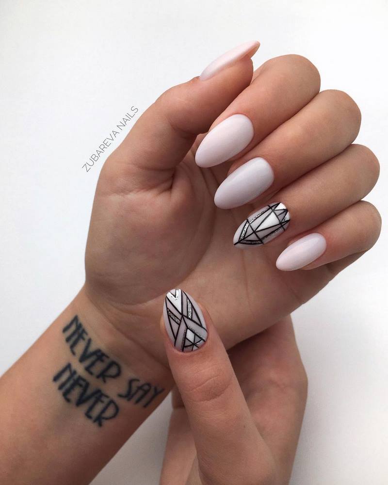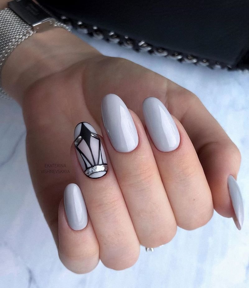 Он отлично сочетается со всеми остальными цветами палитры, более того, контрастно выделяет рисунок, привлекая к нему внимание ценителей. Особо выигрышно смотрится черно-белый маникюр, вдохновленный не то фильмами с Чарли Чаплином, не то лаконичными костюмами Коко Шанель