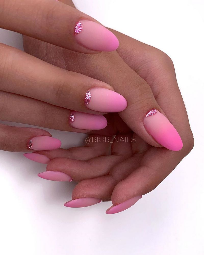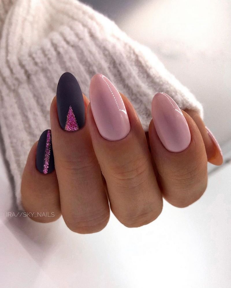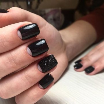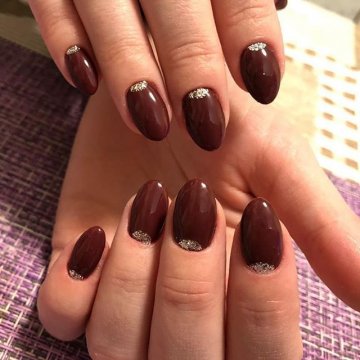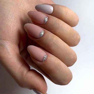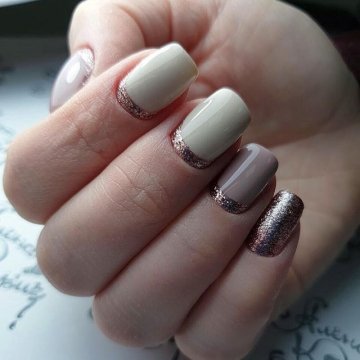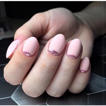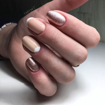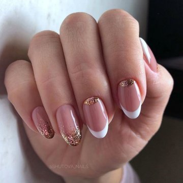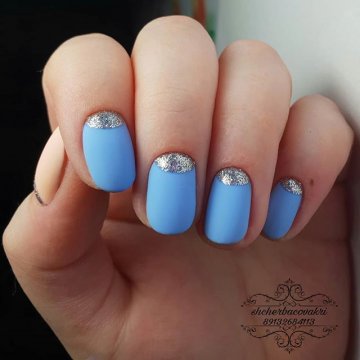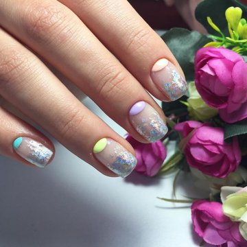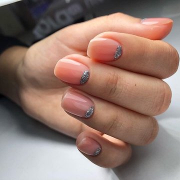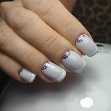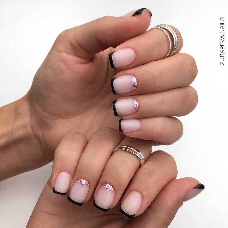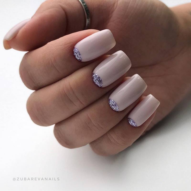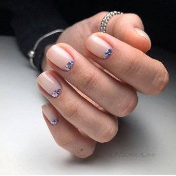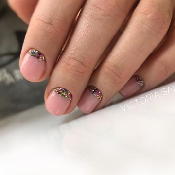 - лунный маникюр с покрытием конфетти по свободному краю;