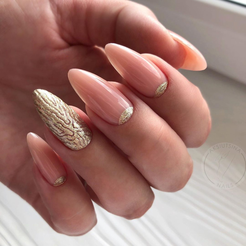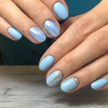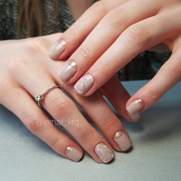Мечтательные, романтичные барышни, в гардеробе которых только шифоновые платья и блузы с рюшами, по достоинству оценят нежный бежевый маникюр. Он выглядит аккуратно и трепетно, неброско и элегантно. Нужно отметить, что к нюдовым оттенкам также принадлежит приглушенный розовый или пыльный голубой, которые прочно обосновались в рейтинге института Pantone.