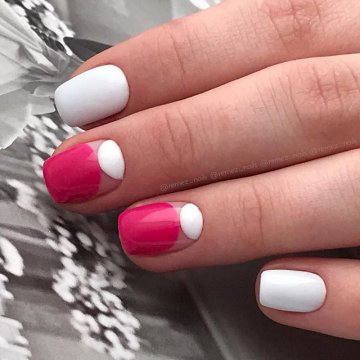 Короткая длина ногтей – это не повод отказывать себе в создании модного маникюра, и дизайн с лунками, благодаря своему многообразию, можно назвать одним из самых удачных вариантов. Здесь можно воплотить в реальность одну из трендовых идей с прозрачной лунулой, которая в свою очередь может быть треугольной, что позволит визуально удлинить основание ногтя, либо выполнить нейл-арт с яркими оттенками лаков. Не менее интересно смотрится на короткой длине блестящая лунула на матовой основе или комбинация френча и лунного маникюра. Очень стильно украсят короткую длину вертикальные рисунки и декоративные украшения в стиле минимализм.