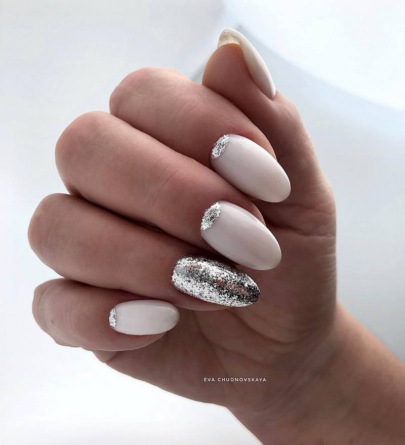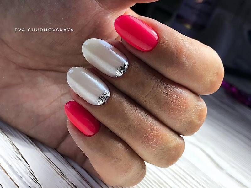 •	Белоснежные акценты – уже не первый год девушки активно прибегают к комбинации всевозможных цветов с безупречным белым: именно белоснежные лунки на фоне нежного лилового, сиреневого, пунцового, кремового, нюдового смотрятся очень элегантно, эстетично и привлекательно. Любительницам более насыщенной цветовой гаммы также нравится использовать белоснежные акценты, но уже не на нежной основе шеллака, а на более ярких и броских вариациях основного покрытия.•	Серебряная окантовка, возложенная на матовый фон – помимо полюбившегося всем золота, девушки зачастую применяют в прикорневой зоне серебряные декоративные элементы поверх основного тона ногтевой пластины (этим тоном может быть абсолютно любой цвет в холодной тональности). Примечательно, что форма лунки при этом выделяется не привычным методом, а отражает симметричную линию изгиба основания роста самого ногтя. Смотрится очень эффектно.