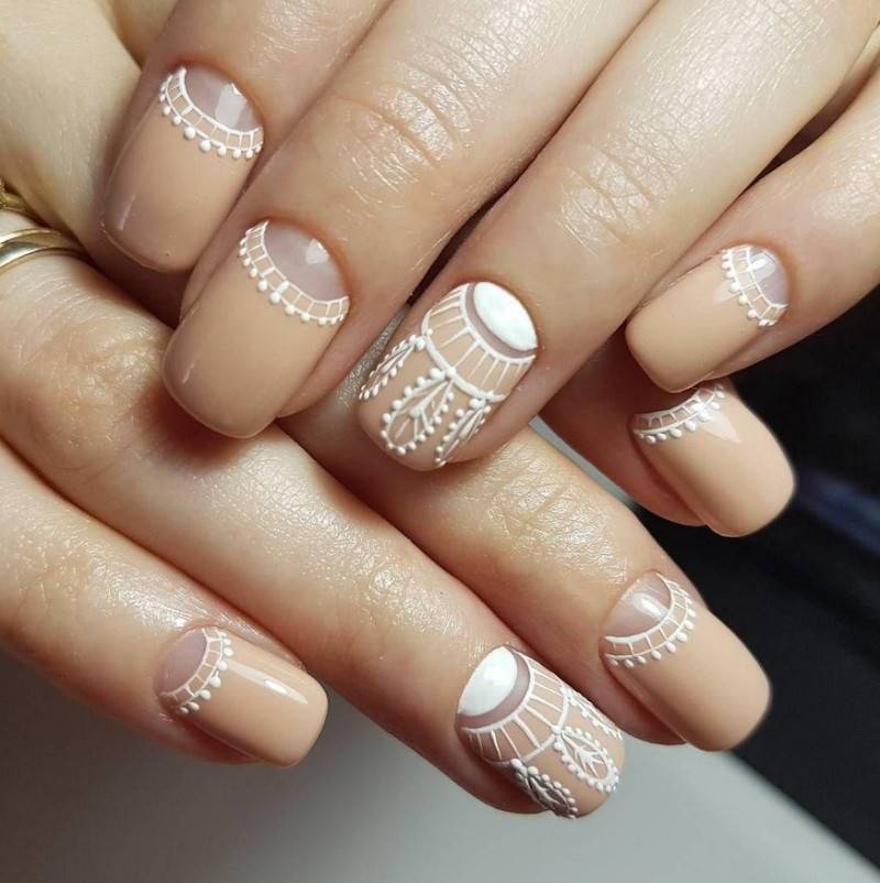 Бежевый. Красивейшие варианты лунного нейл-арта можно создавать с помощью бежевого и других оттенков нюдовой гаммы – от кремового до темно-карамельного. Такой дизайн уместен в офисном стиле, в образе невесты, особенно, с добавлением декора из стразов, камней, втирки, бульонок, блестящих конфетти.