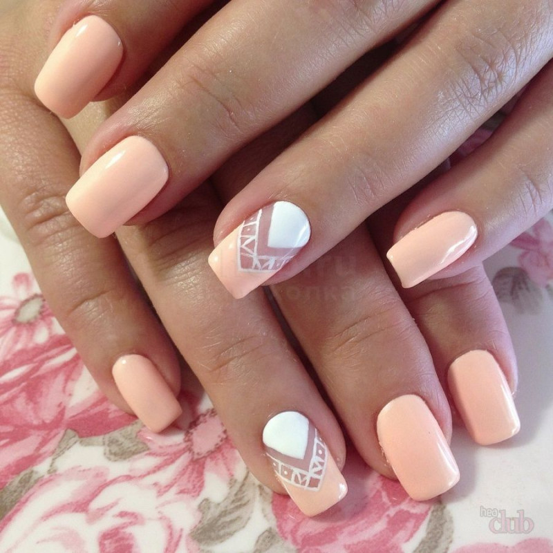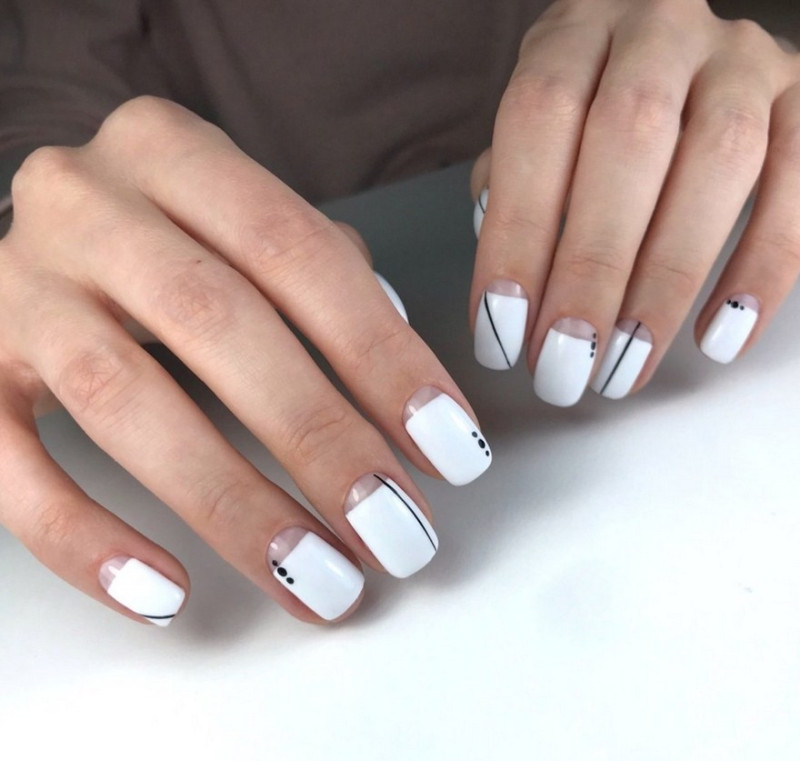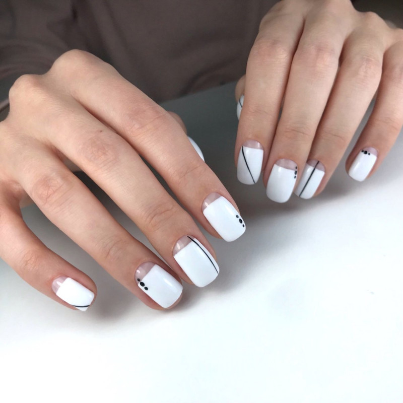 Более оригинально смотрится монохромное белое покрытие с геометрическими элементами. Например, с лункой треугольной формы и тонкой белой линией посередине. В этом случае вам понадобится не только лак, но и тонкая кисточка.