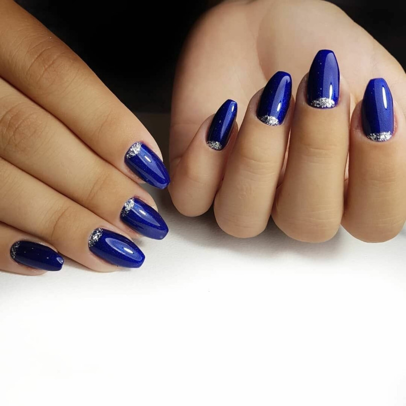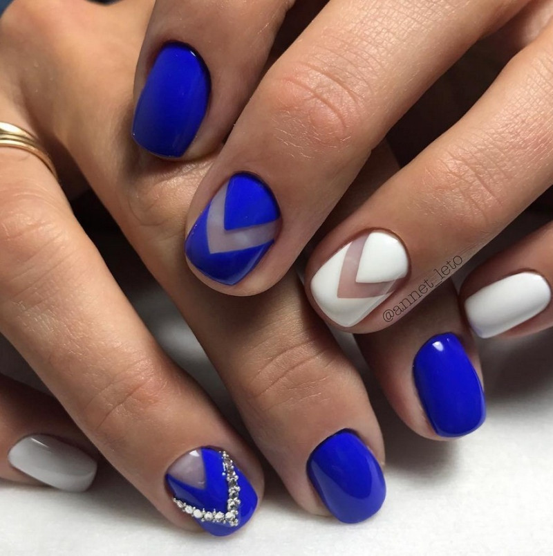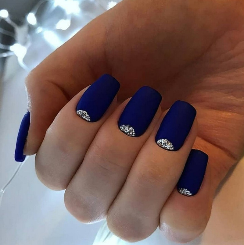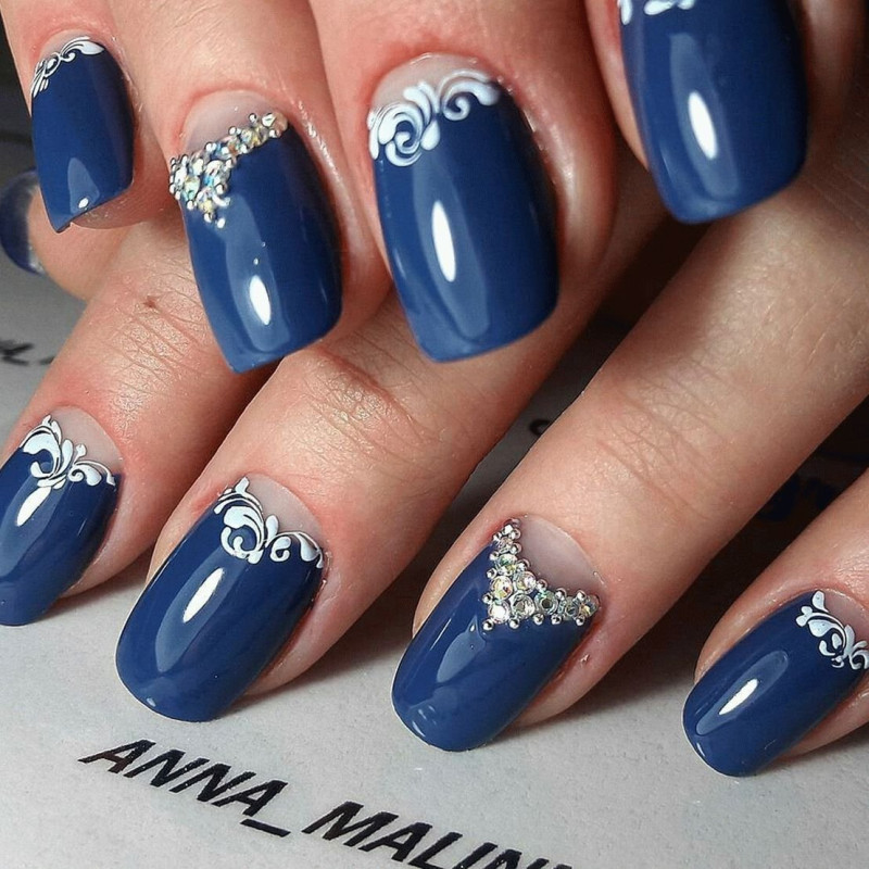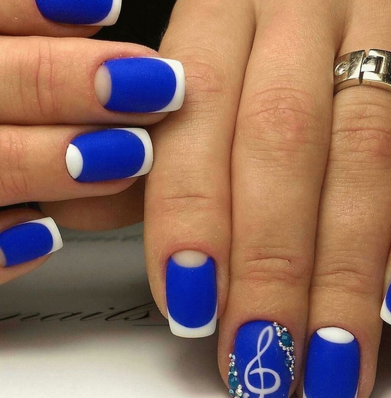 Синий маникюр гармонирует со своими оттенками и серым, желтым, зеленым, коричневым цветом.