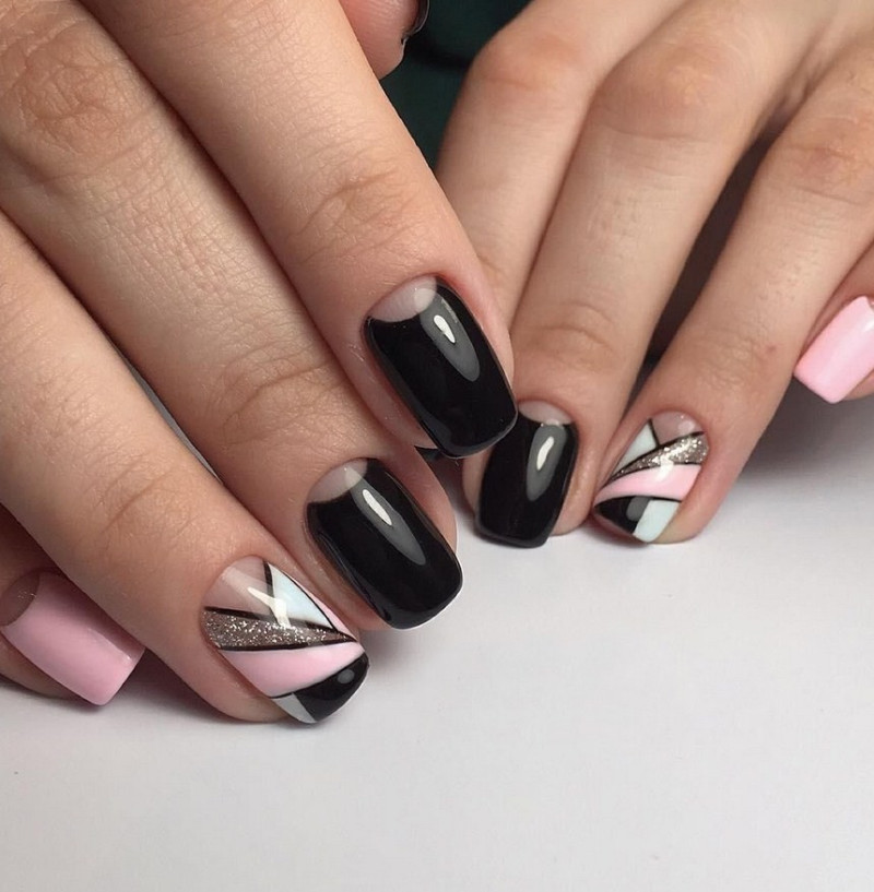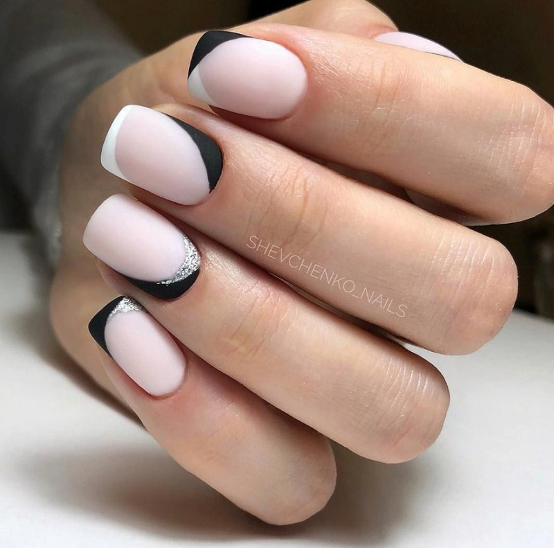 Гель лак и шеллак помогут выровнять ногтевую пластину и подготовить ее к нанесению маникюра. Можно повторить фото-новинки 2021-2022 с использованием этих материалов: за основу берется черный цвет, для заполнения лунки – розовый. Один из ногтей делается матовым, несколько – глянцевым, один – велюровым.