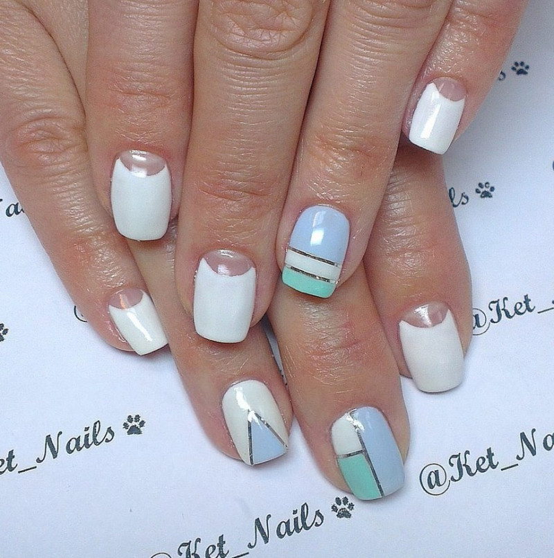 Белый. Этот цвет является нейтральным, ахроматическим, поэтому на его фоне удачно смотрятся все остальные оттенки без исключения. Белые лунки или белые основы ноготка символизируют чистоту и невинность, придают дизайну нежный вид. Также белым можно прорисовать контуры улыбок и лунул в технике двойного френча.