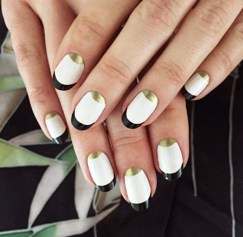 Чтобы усложнить эту идею, можно использовать стразы, расположив их вдоль лунки или прямой линией, пересекающей ногтевую пластину вдоль или поперек. Еще один вариант для любительниц темных ногтей – заполнение черным цветом всей ногтевой пластины и нанесение тонкой золотой линии там, где должны пересекаться фон и лунка.