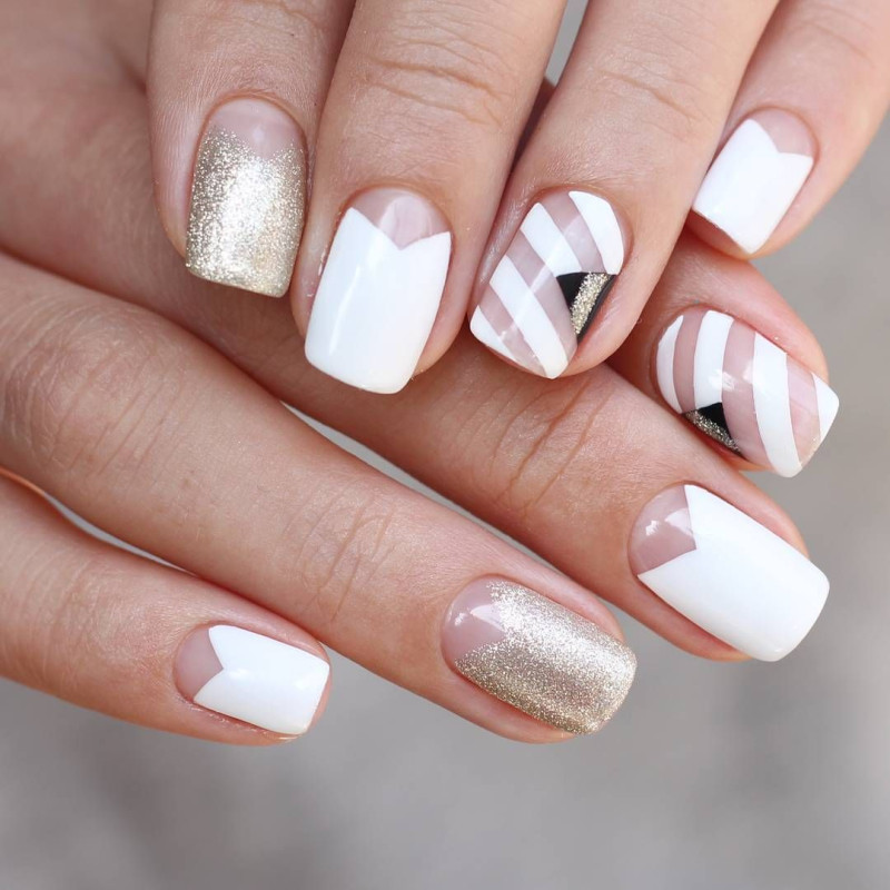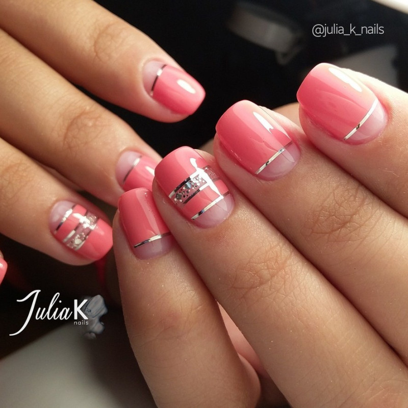 - геометрическая тематика. Линии, точки или параболы выглядят минималистично, но при этом броско. А маникюр с фольгой и вовсе празднично и ярко.