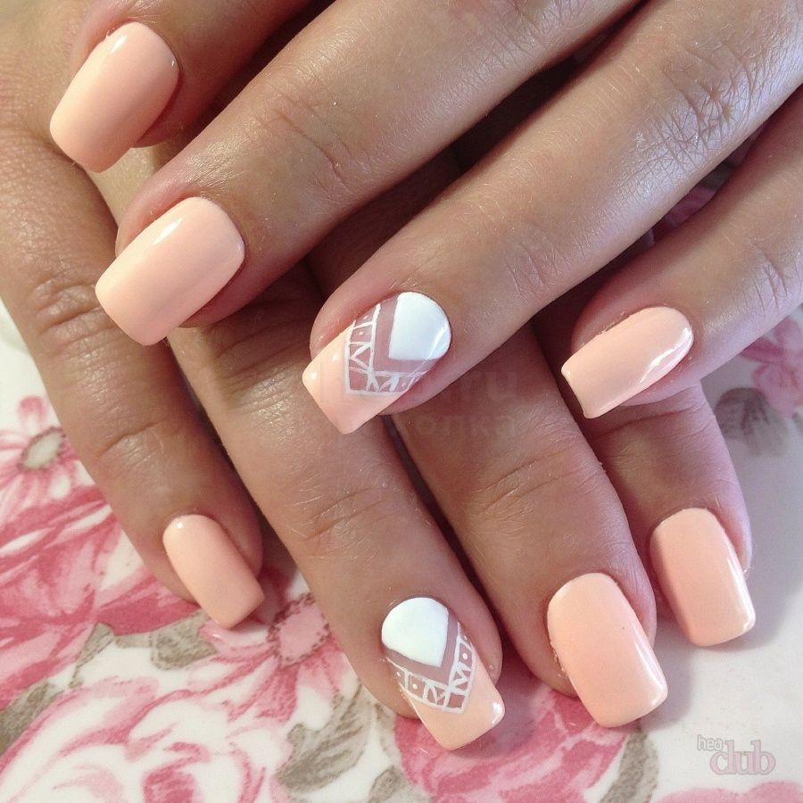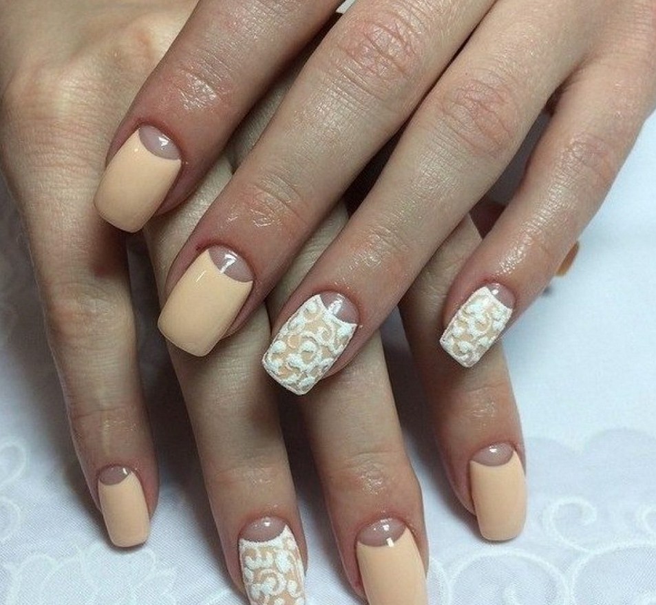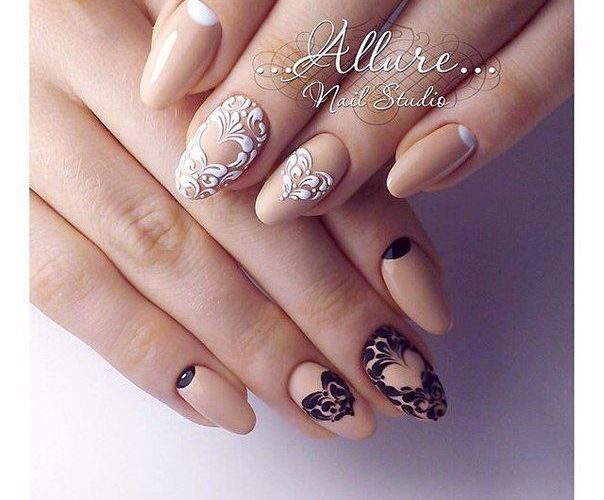 Бежевый маникюр часто наносят с теплыми цветами. Он смотрится очень нежно. Можно совмещать с розовым, кофейным, черным, белым и оттенками красного.