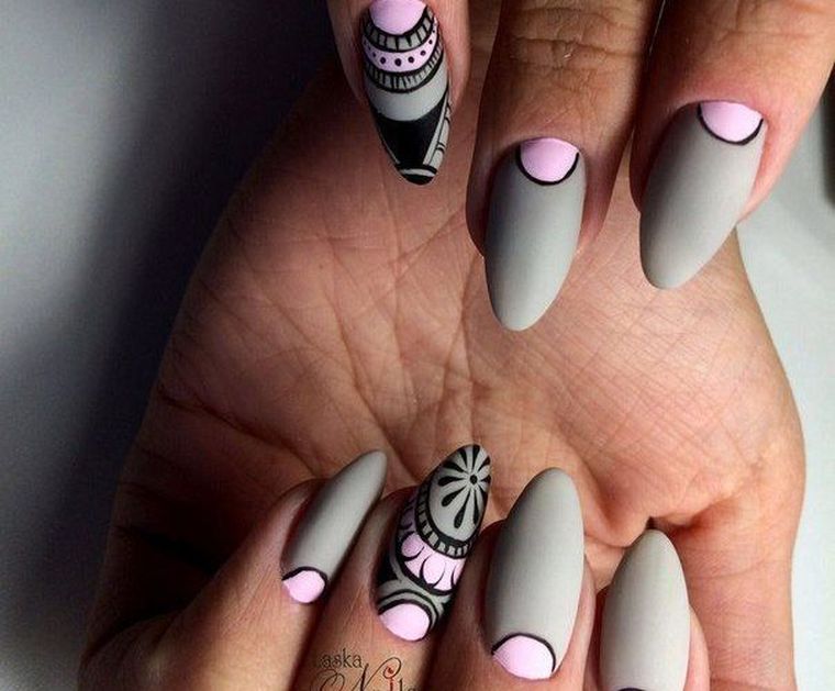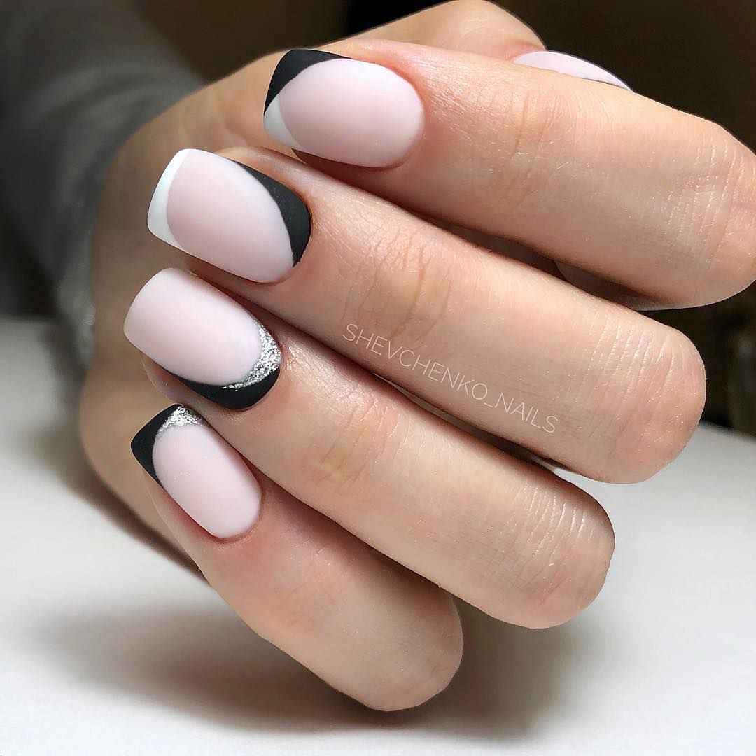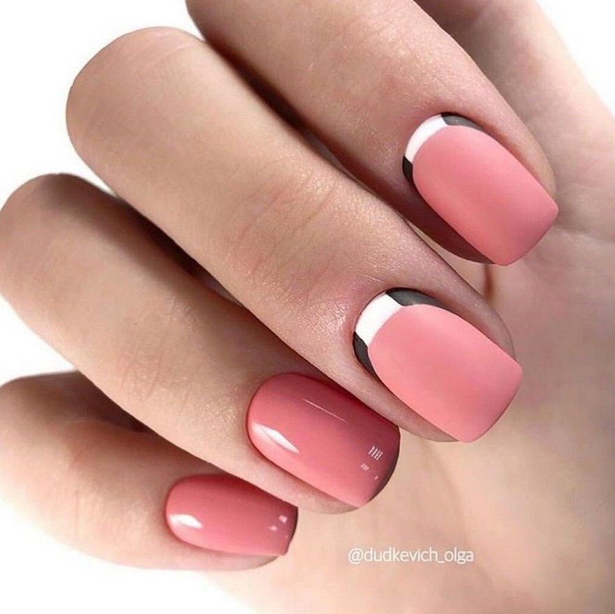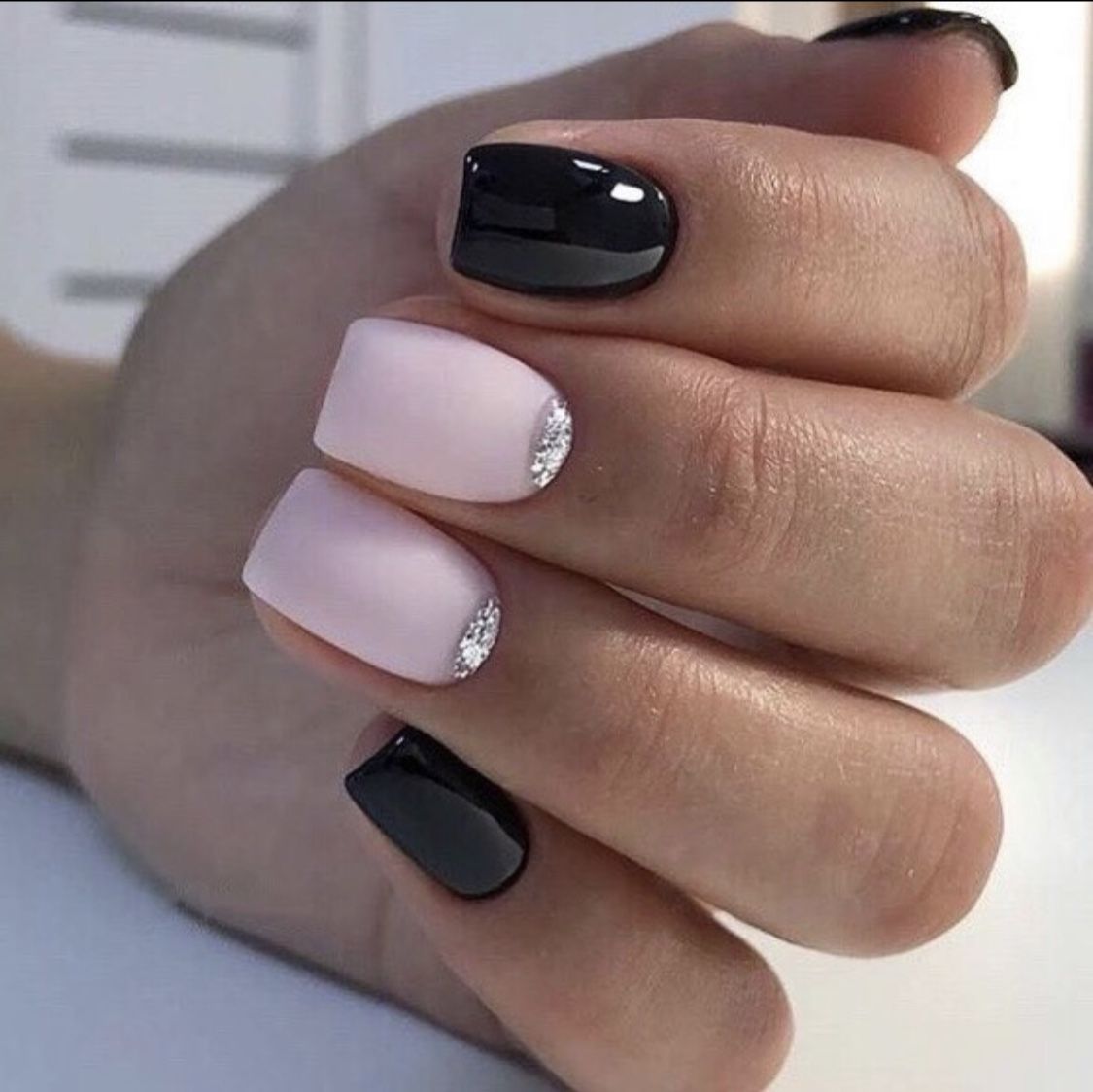 Гель лак и шеллак помогут выровнять ногтевую пластину и подготовить ее к нанесению маникюра. Можно повторить фото-новинки 2021-2022 с использованием этих материалов: за основу берется черный цвет, для заполнения лунки – розовый. Один из ногтей делается матовым, несколько – глянцевым, один – велюровым.