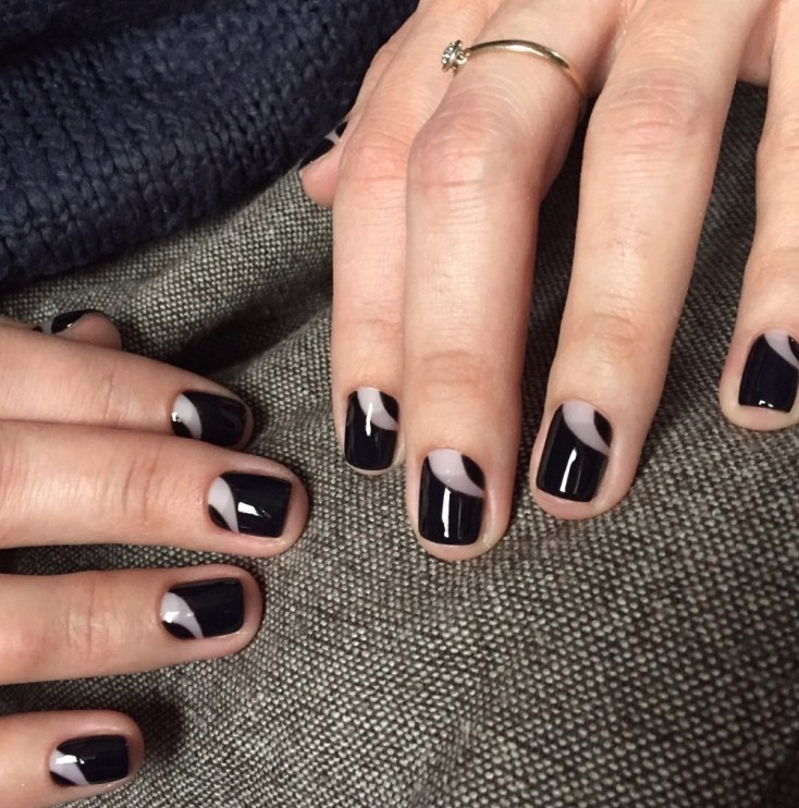Черный. Чистый черный – ещё один ахроматический цвет, который хорошо комбинируется с другими оттенками. Стильно и броско будет выглядеть дизайн, составленный черным и любыми светлыми тонами. Лунный узор получится нежным, изысканным. С красным и прочими яркими цветами дуэт станет страстным, сочным. Очень модная вариация маникюра – черное покрытие с луной без лака.