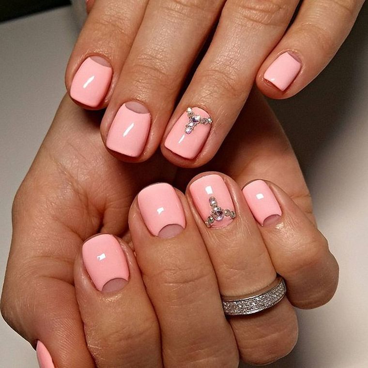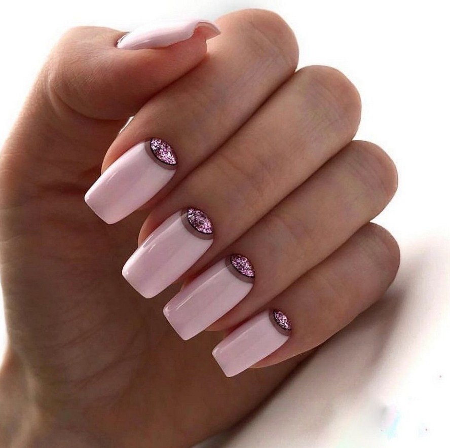Розовый. С розовым тоном шикарно комбинируется белый, многие нюдовые оттенки. Розовыми делают и сами лунулы – все оттенки, от пудрового и дымчатого до фуксии только подчеркнут изящество дуг. Розовый дизайн красиво дополняется стразами, фольгой, глиттером.