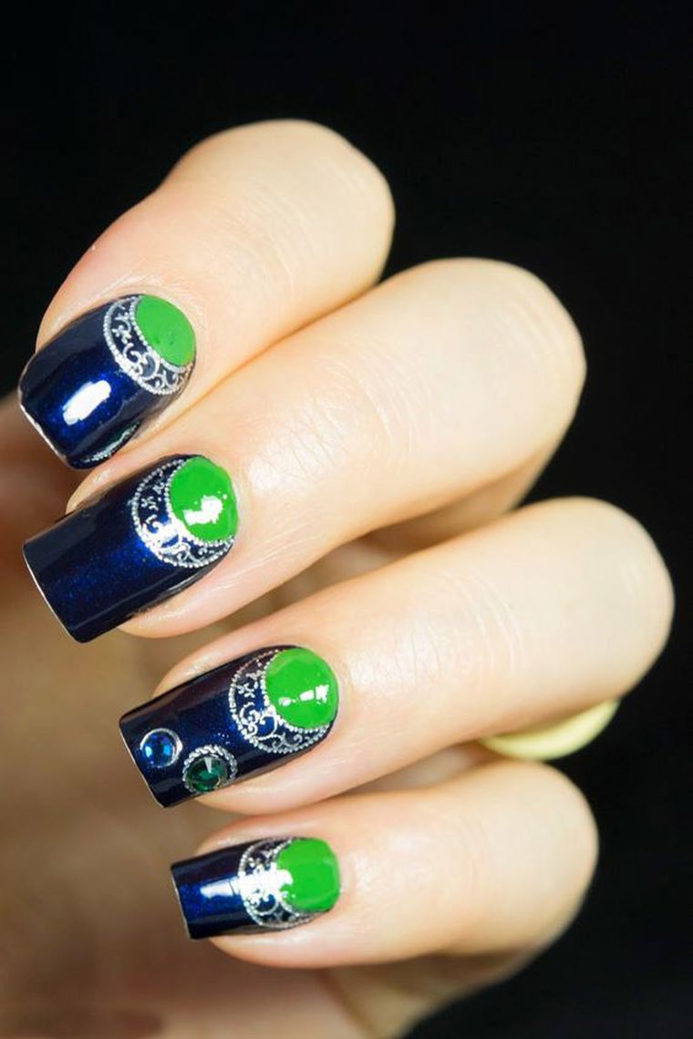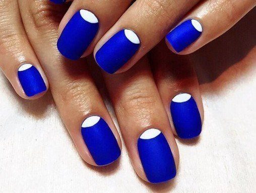 Синий маникюр гармонирует со своими оттенками и серым, желтым, зеленым, коричневым цветом.