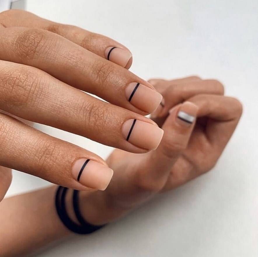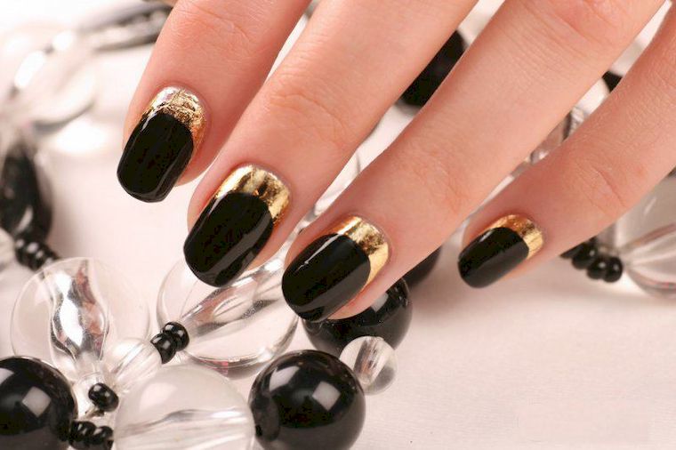 Чтобы усложнить эту идею, можно использовать стразы, расположив их вдоль лунки или прямой линией, пересекающей ногтевую пластину вдоль или поперек. Еще один вариант для любительниц темных ногтей – заполнение черным цветом всей ногтевой пластины и нанесение тонкой золотой линии там, где должны пересекаться фон и лунка.