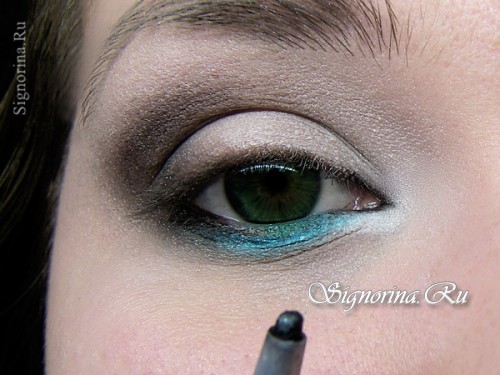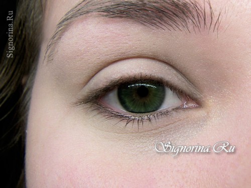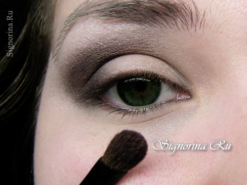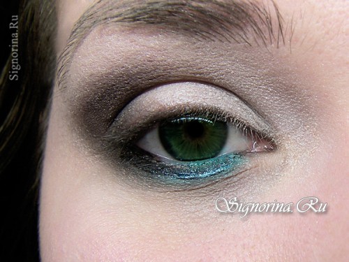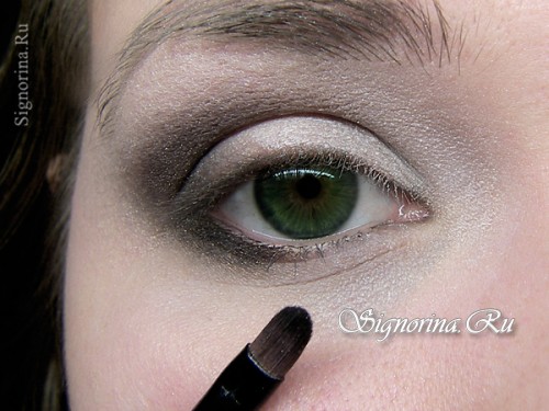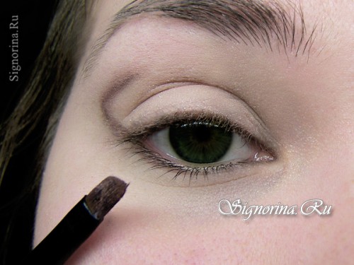 4) Приступаем к оформлению нижнего века. Сперва слегка затемним его тем же коричневым оттенком, что использовали ранее.