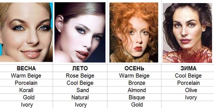 Весна. Кожа у этих женщин с желтоватым или персиковым оттенком. Цвет волос у них обычно рыжий (светлый), русый или медовый. Глаза в основном светлые: голубые, зеленые, янтарные. Очень редко — темные. Таким девушкам при нанесении декоративной косметики подойдут более легкие, нежные и естественные цвета. Им идет темно-коричневый карандаш для бровей и век. Подойдут тени с золотистыми оттенками, коралловые, нежно-розовые, сиреневые или аквамарин. Можно нанести абрикосовые или персиковые румяна. При макияже губ рекомендуется использовать розовые тона, лиловые, коричневые или бронзовые цвета.